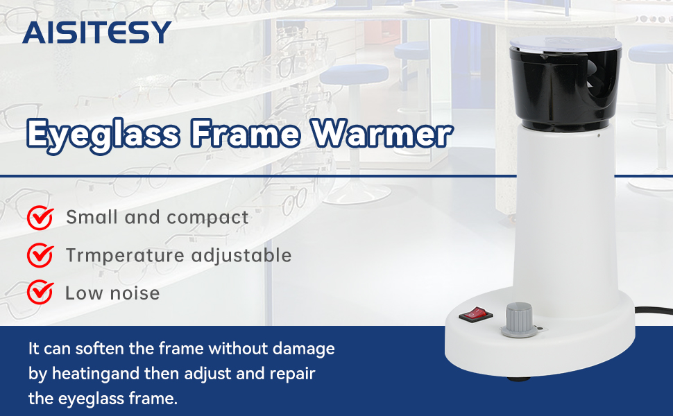 - Algunos clientes pueden preguntar: ¿Por qué este calentador de marco no se calienta rápidamente? Si se calienta demasiado rápido o demasiado alto, puede dañar o quemar la superficie de los marcos de anteojos de plástico. Se calienta relativamente lentamente y hace un buen trabajo al proteger los marcos de anteojos de plástico de daños o quemaduras. Ten paciencia durante el proceso de calentamiento.
