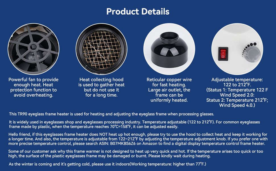 - 【Un año de garantía】Para calentar y ajustar marcos de anteojos al procesar anteojos. Para marcos de anteojos normales hechos de plástico, se puede ajustar fácilmente cuando la temperatura alcanza los 70 ℃ = 165 °F. Dado que el invierno se acerca y el clima se está enfriando, por favor, utilícelo en interiores (temperatura de trabajo: por encima de 75 °F).