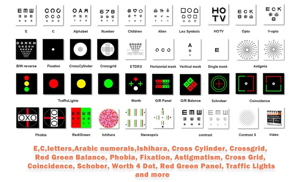 - Comprehensive test: Covers Ishihara test, cross cylinder, red-green balance, fixation, astigmatism, cross grid, coincidence, Schuber, Voss 4-point, red-green board, traffic light, etc. Supports continuous testing within a distance of 1m to 7m, randomly arranges the vision chart, provides imperial or metric options, and has randomization and mirroring functions.