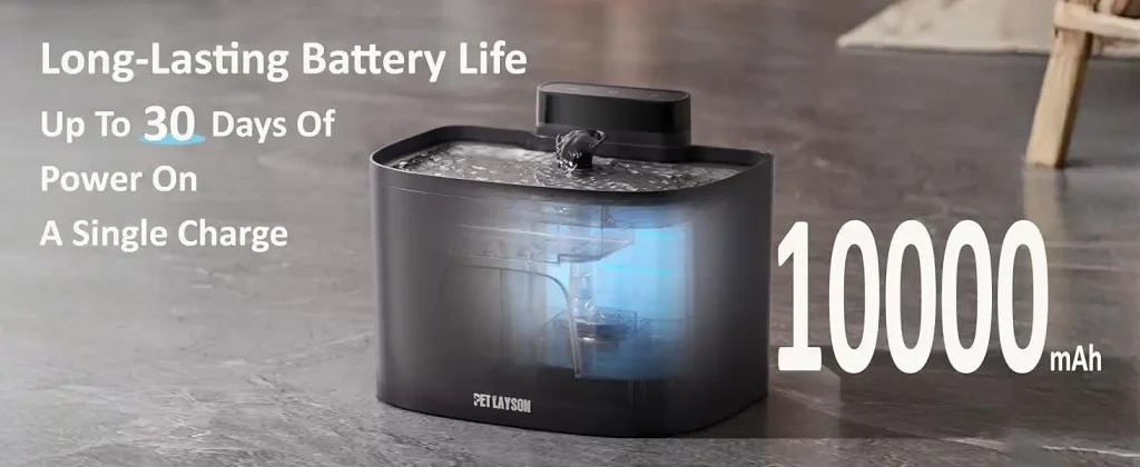 - Long-Lasting Battery Life: Cat fountains for drinking with a built-in 10,000mAh rechargeable battery, the petlayson cat water fountain delivers fresh, clean water on a full charge and allow you to travel freely. Cat water dispenser equipped with fast-charging chip and removable battery for easy recharging which making it ideal choose for busy pet owners or during power outages.
